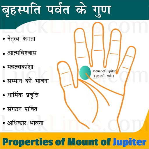 - यदि हाथ स्पष्ट (Clear Palm) और संतुलित हो, तो बृहस्पति पर्वत को हस्तरेखा विज्ञान (Palmistry) में अत्यंत उत्कृष्ट माना जाता है। यह दृढ़ चरित्र, आत्मविश्वास और उद्देश्य की शक्ति (Power of Determination) से सफलता के स्पष्ट संकेत देता है।